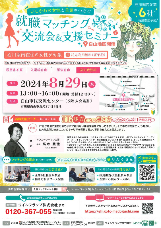 いしかわの女性と企業をつなぐ就職マッチング交流会&支援セミナーを白山市にて開催します。