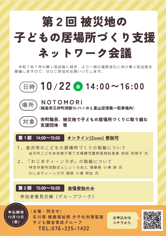 能登半島地震及び奥能登豪雨を受け、県内外の支援団体の方々が被災地で子どもの居場所づくりの活動を実施する中、活動の促進に向けた関係機関の連携強化のための会議を開催します。