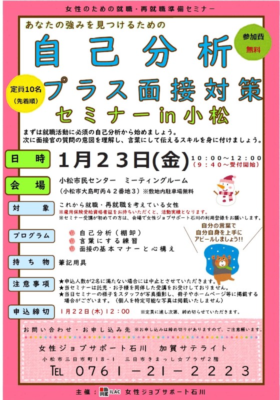 【1月23日(金)開催!】自己分析プラス面接対策セミナーin小松
