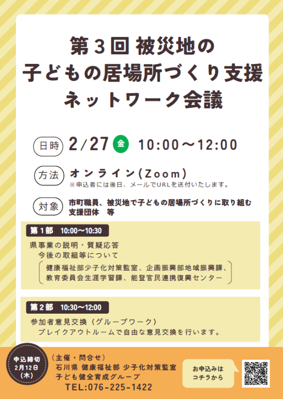 被災地における子どもの居場所づくり活動の促進に繋げるため、関係機関の連携強化に向けたネットワーク会議を開催いたします。