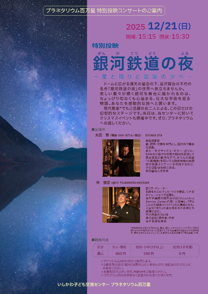 新着情報 プラネタリウム特別投映「銀河鉄道の夜」(12/21(日))15:30~ 特別投映「銀河鉄道の夜~星と語りと音楽の夕べ~」 12月21日(日) 開場15:15 開演15:30 PDFファイル↓ 銀河鉄道の夜2025Dec_FlyerA.pdf チケットは当日9:00から販売いたします。