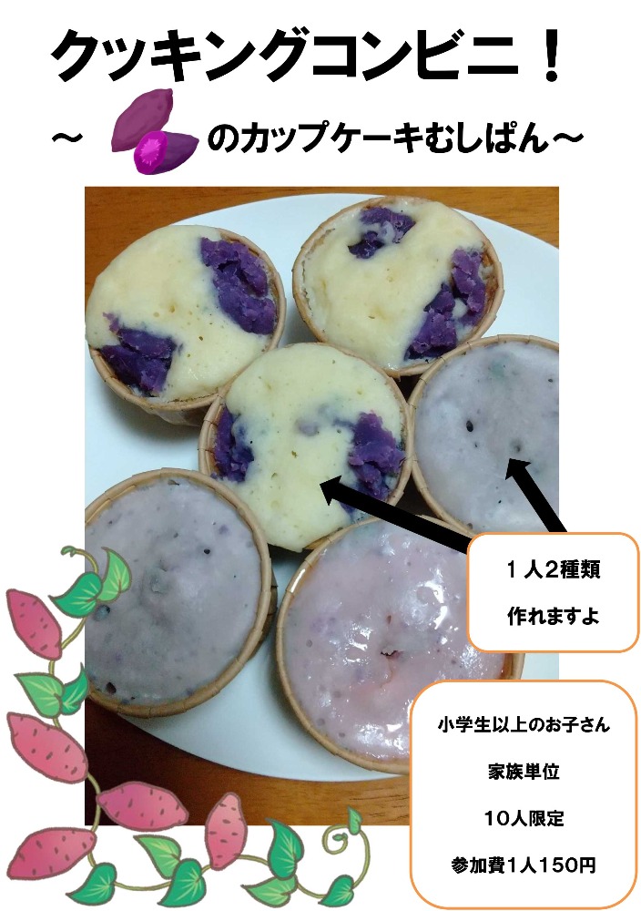 電子レンジを使ってとても簡単に作れるさつまいものカップケーキ蒸しパンを作ります。材料にホットケーキミックス、牛乳、砂糖、バター、さつまいもを使います。材料にアレルギーのある方は、申し込みはできません。あたたかい出来立てが一番おいしいです。サイズは小さいですが、1人2個作ることができます。飲み物は用意できないので、必要な人は持ち込みでお願いします。冬休み自宅でもぜひ作ってください。