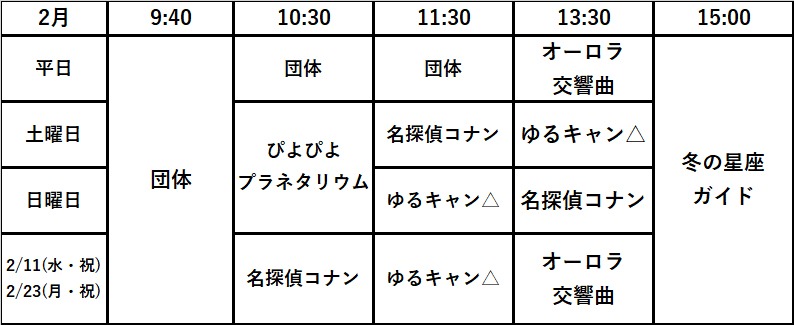2026年2月1日(日)~2月28日(土)のスケジュール※2/13(金)はメンテナンスのためプラネタリウムは休演です