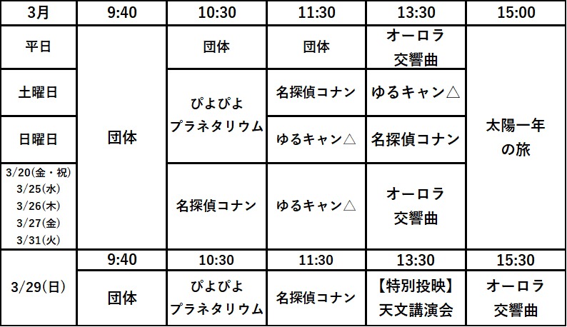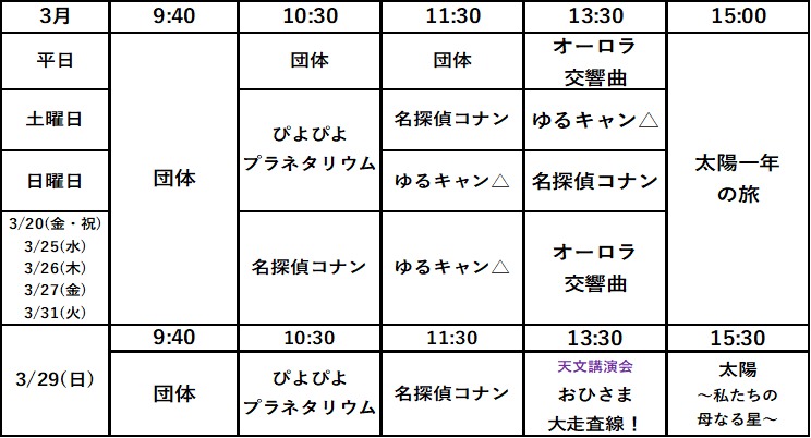 2026年3月1日(日)~3月31日(火)のスケジュール※3/13(金)はメンテナンスのためプラネタリウムは休演です