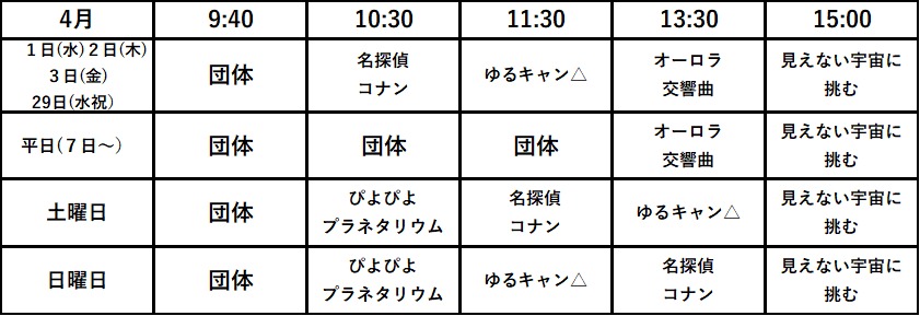2026年4月1日(水)~4月30日(木)のスケジュール※4/10(金)はメンテナンスのためプラネタリウムは休演です